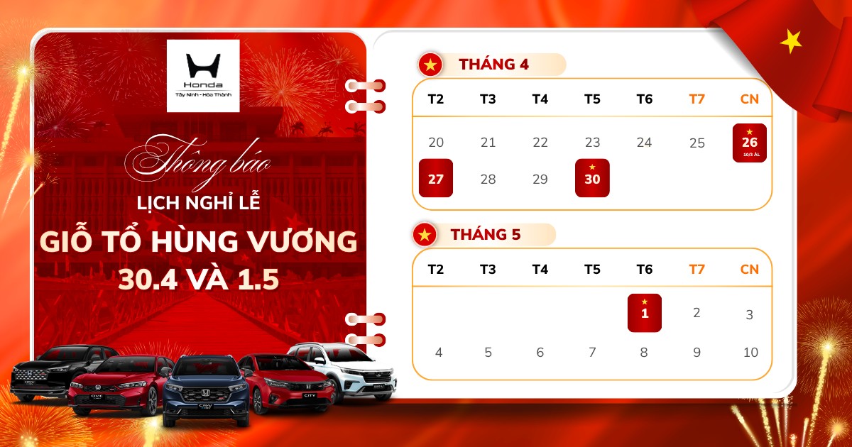 Honda Ô tô Tây Ninh – Hòa Thành trân trọng thông báo đến Quý Khách hàng & Đối tác lịch nghỉ lễ như sau: